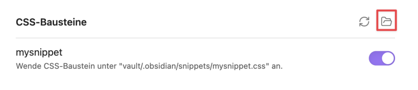 Ein häufiger Grund den Ordner zu öffnen ist, die CSS-Snippets zu editieren. Dafür kann das Ordner-Icon in den Einstellungen -> Darstellungen -> CSS-Bausteine genutzt werden.
