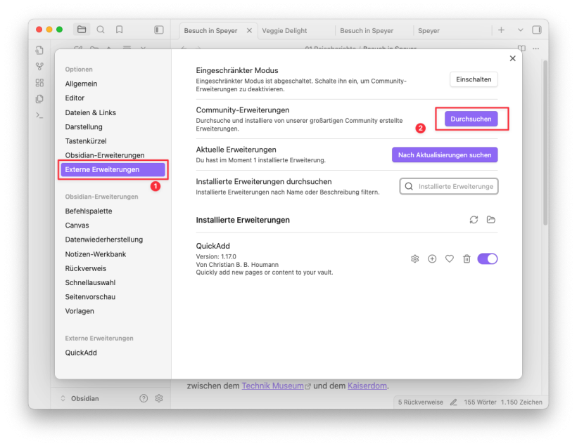 Die Dataview-Erweiterung ist eine externe Erweiterung, die zunächst installiert werden muss. Öffne dazu die Obsidian-Einstellungen, wähle die Option „Externe Erweiterungen“ (1) und klicke rechts auf den Button „Durchsuchen“ (2).