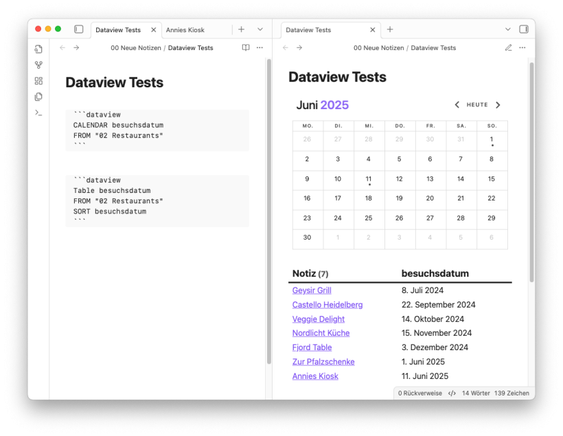 Der Ausdruck CALENDAR zeigt die gefundenen Notizen nicht als Zeile mit allen Informationen, sondern nur als kleine Punkte unterhalb des Tages in einem Kalenderblatt an. Diese Punkte sind anklickbar. Pro Notiz, die mit der Abfrage übereinstimmt, wird ein Punkt dargestellt. Im Bild unten siehst du, dass am 1.6. und am 11.6.2025 ein Restaurantbesuch stattfand.