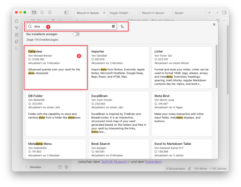 Gib im Suchfeld (1) „data“ ein, dann sollte die Kachel für die „Dataview“-Erweiterung (2) direkt angezeigt werden.