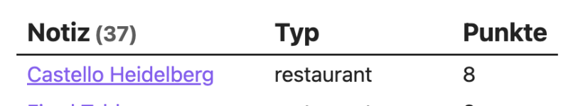 Bei diesem Aufruf wird eine Tabelle mit allen Notizen erstellt. Die erste Spalte zeigt den Namen und Link zu der Notiz, die zweite, welcher Wert an der Eigenschaft notizen_typ angegeben wurde, das AS definiert den Namen dieser Spalte, in der nächsten Spalte werden die bewertung mit 2 multipliziert und in der Spalte Punkte angezeigt.