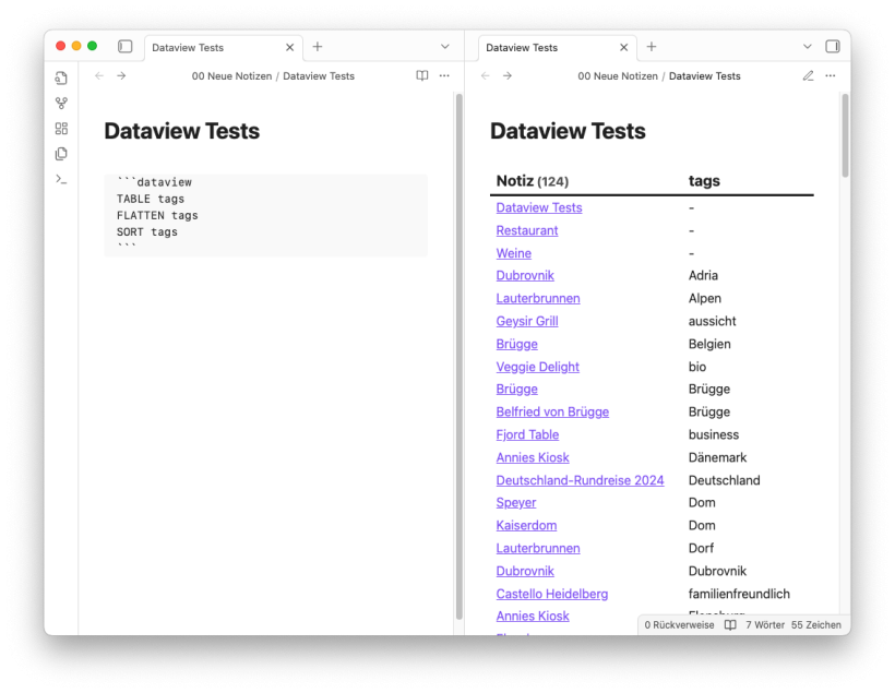 Ich gebe in den folgenden Abschnitten einen Überblick der einzelnen Abfrage-Parameter. Probiere die Beispiele aus. Nutze dazu eine Ansicht in Obsidian, in der du die gleiche Notiz links im Quellcode anzeigst und rechts im Lese-Modus: