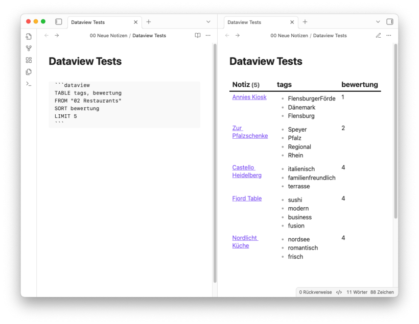 Der Abfrage-Parameter FROM schränkt das Ergebnis ein. So wird der folgende Aufruf nur Notizen aus dem Ordner „02 Restaurants“ anzeigen. Außerdem zeigt dieser Aufruf, dass du die Möglichkeit hast, die Werte für die Anzeige in der Tabelle zu manipulieren. Hier habe ich eine arithmetische Funktion gewählt. Du könntest aber auch z.B. zusätzlichen Text angeben, etwa bewertung + " Punkte".
