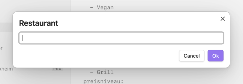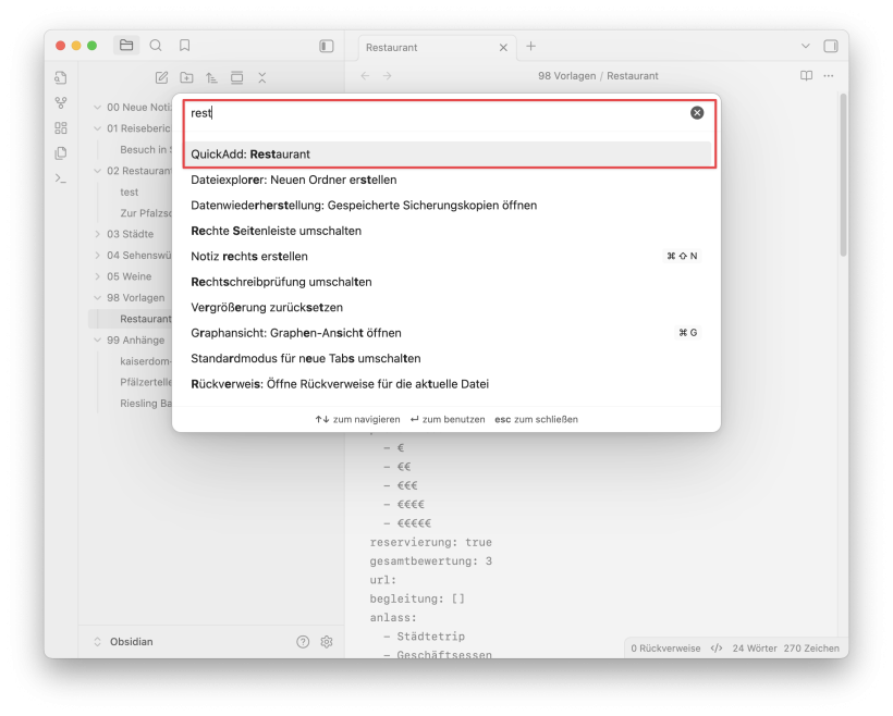 Nachdem du den Namen eingegeben und mit „OK“ bestätigt hast, erledigt QuickAdd den Rest: Die neue Notiz wird automatisch im Ordner 02 Restaurants erstellt, mit der „Restaurant-Vorlage“ befüllt und sofort zum Bearbeiten geöffnet.