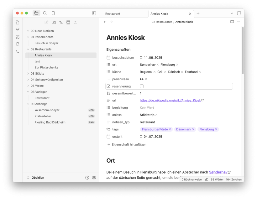 ort: []Mit den[]wird diese Eigenschaft als leere Liste definiert. So kannst du später einen oder mehrere Orte eintragen.küche:Diese Eigenschaft ist ebenfalls eine Liste, die bereits eine Auswahl an möglichen Werten enthält. Nicht passende Einträge kannst du einfach löschen, was schneller geht, als alles neu zu tippen. Du kannst aber auch einfach neu Einträge hinzufügen.preisniveau:Ähnlich wie beikücheist auch hier eine Liste mit vordefinierten Werten hinterlegt.reservierung:Die Eigenschaftreservierungsoll in der Darstellung im Live-Preview und Leseanzeige als Checkbox dargestellt werden, daher wir diese Eigenschaft mit dem Wertfalsevorbelegt.gesamtbewertung:Hier ist eine Zahl als Platzhalter vorgesehen. Alternativ könntest du auch ein Bewertungssystem mit Symbolen (z.B.⭐️⭐️⭐️) als Text verwenden.url:Ein Textfeld für die Web-Adresse des Restaurants. Obsidian macht die URL automatisch klickbar, es muss aber die gesamte URL angegeben werden.notizen_typ:Diese Eigenschaft ist fest mitrestaurantvorbelegt, um diesen Notiz-Typ eindeutig zu identifizieren. Dies ist präziser als ein Tag, da die Eigenschaftnotizen_typexklusiv für diese Klassifizierung verwendet wird.tags:Dieses Feld ist bewusst leer gelassen, um individuelle Tags für jedes Restaurant hinzuzufügen. Du könntest hier aber auch Standard-Tags als Liste vorab eintragen.erstellt: {{date}}Der Ausdruck"{{date}"}ist ein Platzhalter der Vorlagen-Erweiterung. Beim Einfügen der Vorlage wird er automatisch durch dasktuelle Datum im FormatYYYY-MM-DDersetzt.
