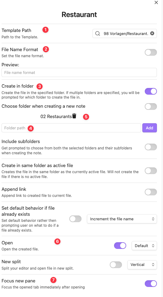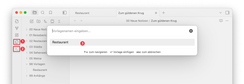 Unabhängig vom gewählten Weg erscheint ein Dialog (3), in dem du die Vorlage „Restaurant“ auswählst. Sobald du sie eingefügt hast, kannst du damit beginnen, das Frontmatter anzupassen und zu ergänzen.