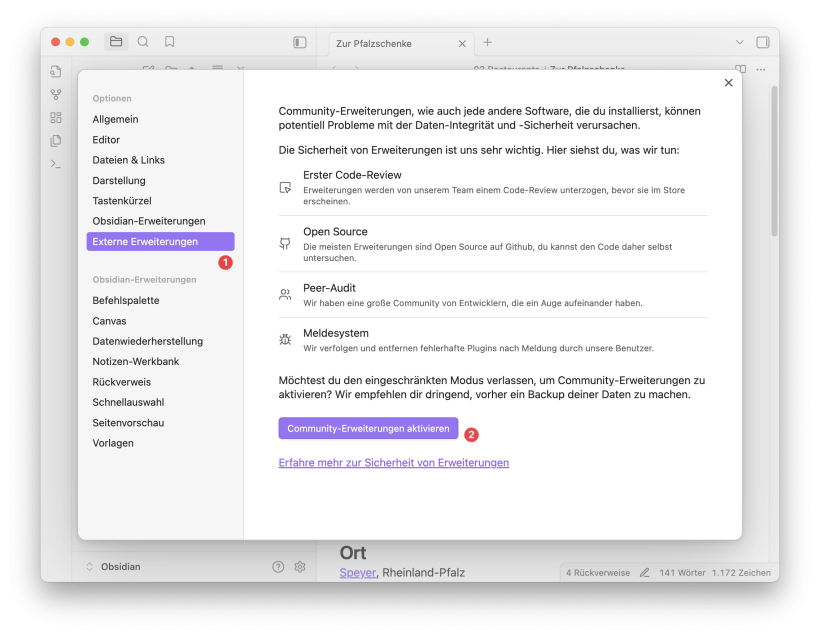 Obsidian zeigt dir nun eine Warnung an, dass von externen Erweiterungen potenziell ein Sicherheitsrisiko ausgehen kann, auch wenn das Entwicklerteam Maßnahmen ergreift, um dieses Risiko zu minimieren. Lies dir den Hinweis durch und klicke anschließend auf den Button „Community-Erweiterungen aktivieren“ (2).
