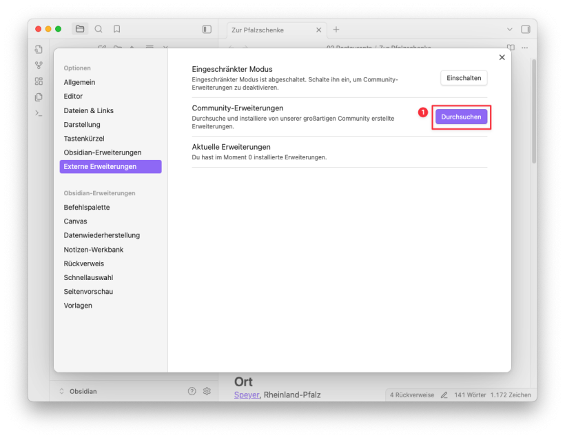 Da QuickAdd eine externe Erweiterung ist, musst du Obsidian zunächst erlauben, Erweiterungen dieser Art zu laden. Gehe dazu in die Einstellungen und wähle den Punkt „Externe Erweiterungen“ (1).