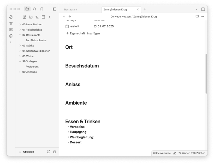 Eine Vorlage mit einem vordefinierten Frontmatter ist bereits eine große Arbeitserleichterung. Der eigentliche Mehrwert entsteht aber, wenn du auch die inhaltliche Struktur vorgibst. Viele Notizen, wie das Restaurant-Beispiel, folgen einem wiederkehrenden Aufbau: