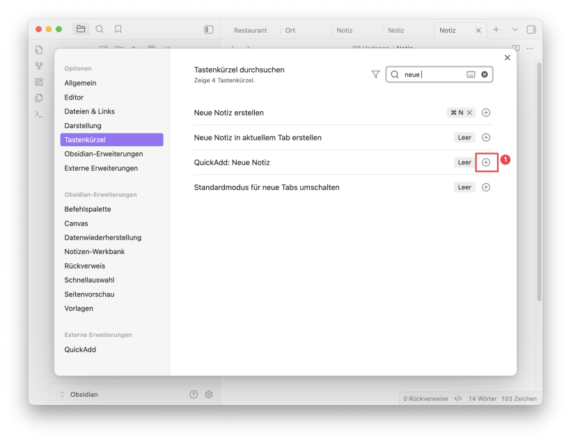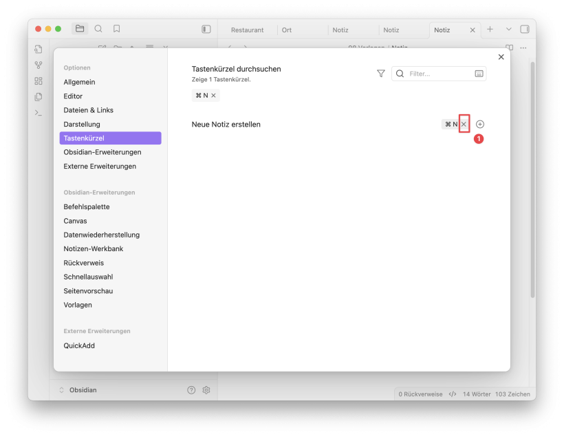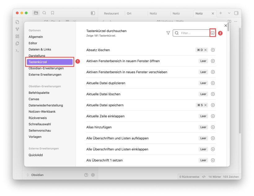 - Gehe in die Obsidian-Einstellungen und wähle Tastenkürzel (1).
