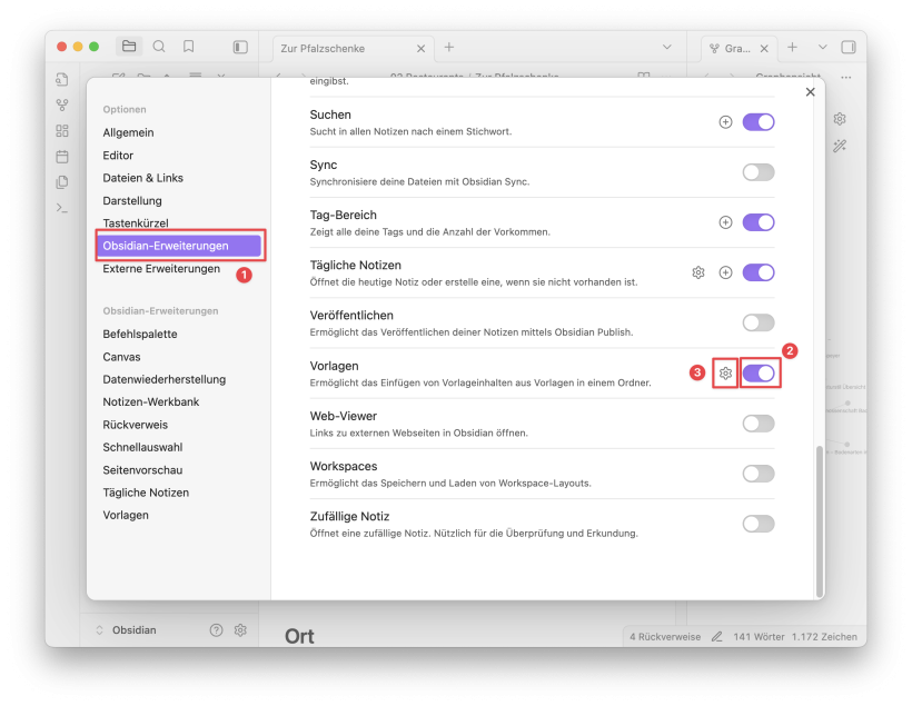 Gehe dazu in die Einstellungen und wähle links den Punkt Obsidian-Erweiterungen aus (1). Aktiviere bei der Erweiterung „Vorlagen“ den Schalter (2) und klicke anschließend auf das Zahnrad-Symbol (3), um zu den zugehörigen Einstellungen zu gelangen