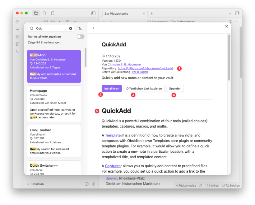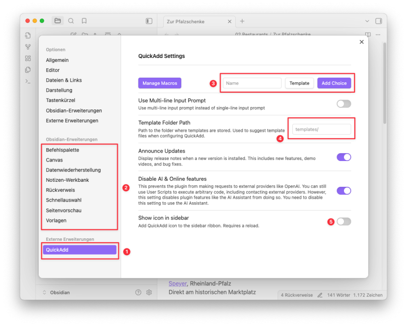 Genau diese Schritte kannst du mit der externen Erweiterung QuickAdd automatisieren. Das Ziel ist, mit nur einer Aktion eine neue Restaurant-Notiz zu erstellen, die automatisch die richtige Vorlage verwendet und sofort im Ordner Restaurants landet.