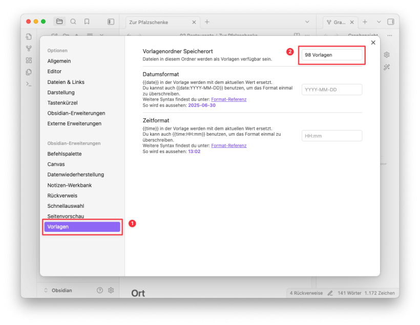 Nun wechselst du in die Einstellungen für die Erweiterung Vorlagen (1) und trägst in das Feld „Speicherort für Vorlagen“ (2) den Namen des eben erstellten Vorlagen-Ordners ein.